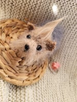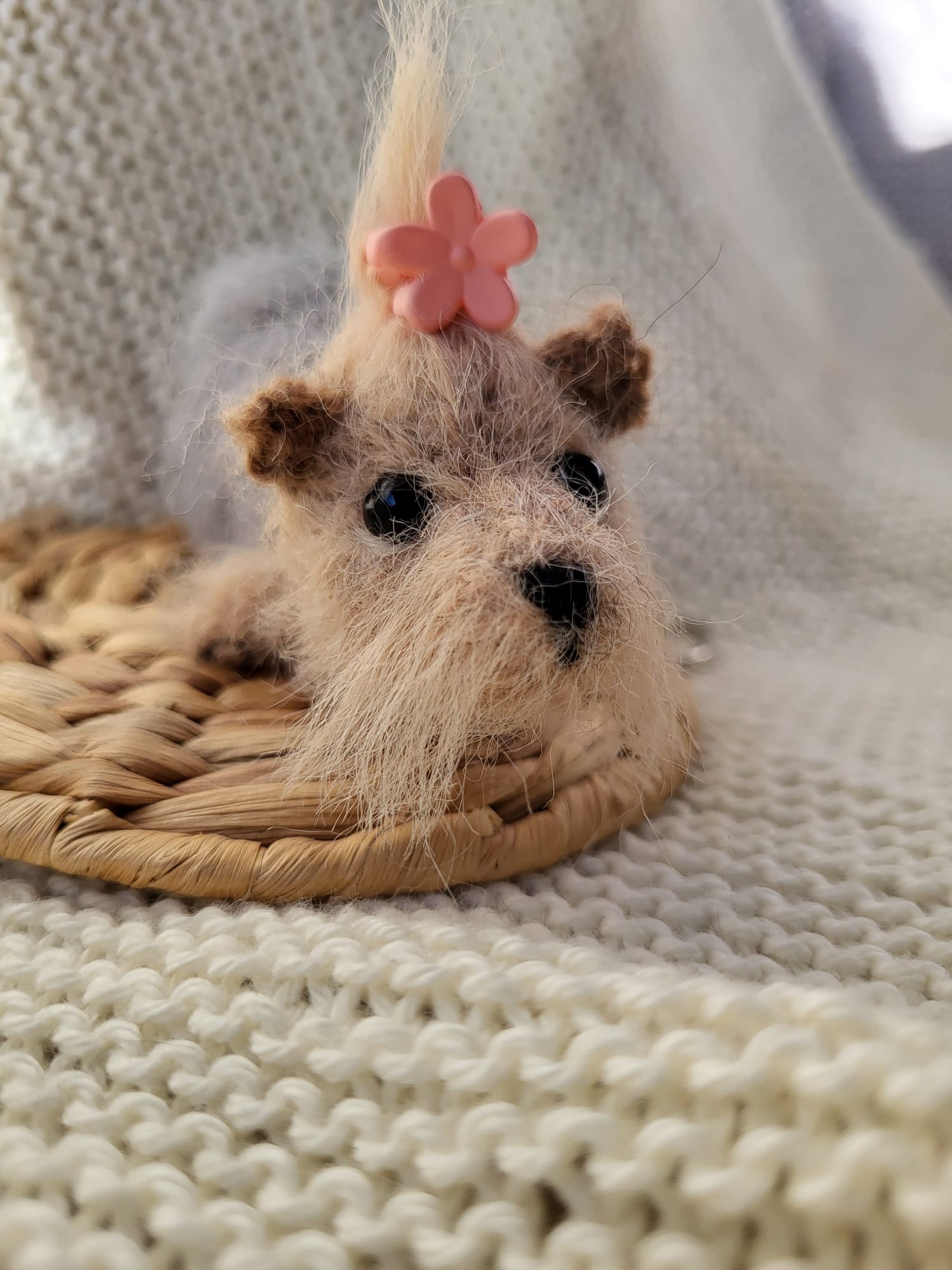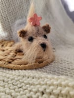 This adorable little pup is entirely handcrafted from soft, fluffy wool. With his big shiny black eyes, perky ears, messy tuft of hair, and a sweet pink flower on top, he instantly brings a smile.